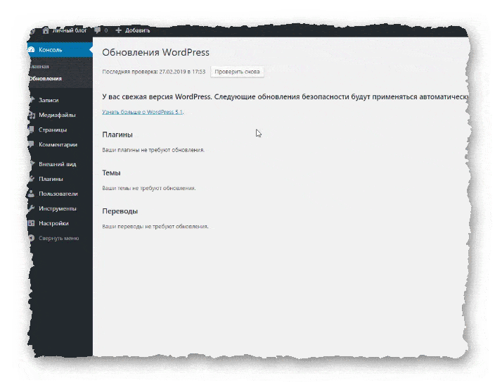 - Следующим в разделе консоль, идёт раздел «Обновления». Тут отражается состояние обновлений самой cms, плагинов, тем, и переводов.